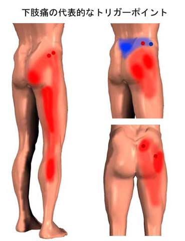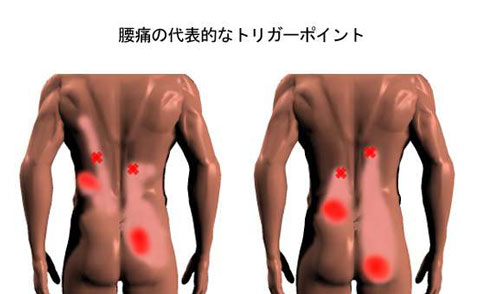 ●筋・筋膜痛症候群とは 急性の筋肉の障害や、筋肉の反復性の過負荷ストレス(使いすぎ)により、筋肉内に硬いしこりのような部分(緊張帯)ができ、そこにトリガーポイント(特に強く痛みを感じる点)が見出される状態で、活性化しているトリガーポイントを持つとその場所近辺のみならず離れた場所に関連痛(放散する痛み)が現れる。 このような状態が2〜3ヶ月以上続いている状態を筋・筋膜痛症候群という。 トリガーポイント を刺激する(押す、つまむ)と、文字通りそれが引き金点となり、関連痛が強くなったり、潜在性のトリガーポイント(関連痛が出るまでに至っていない状態)の場合は、関連痛領域に放散する痛みが現れる。 肩こりの時に起こる、後頭部からこめかみ、目の周囲に現れる頭痛も、肩の筋肉(僧帽筋)のトリガーポイントの関連痛であると言われている。 筋・筋膜痛症候群の対処法 筋・筋膜痛症候群のとき、ペインクリニックでは トリガーポイント への局所麻酔の注射を行いますが、一般 の人でも行える方法としては トリガーポイントの圧迫 があります。 筋肉の強張ったところにひときわ痛みが強く感じられる部分(トリガーポイント)を探し出し、指で押す(場所によってはつまむ)強さは我慢できる程度で、同じ強さのまま持続的に圧力をかけておくと、多くは1分以内に痛みが感じられなくなります。 痛みが感じられなくなったら、少し力を加え同じ事を2〜3度繰り返します。あまり強い力で行いすぎるとかえって緊張するので注意してください。 肩こり・腰痛・下肢痛の代表的な トリガーポイント 形成点を下の図に記します。 前述の処置をした後はストレッチ及びエクササイズを行うと良いでしょう。 ![]() ![]()
